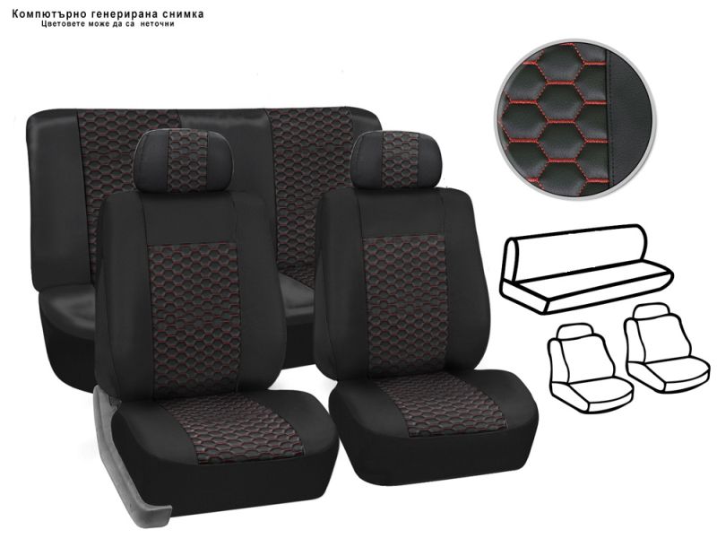 Състои се от калъфи за предни седалки, калъф за задна седалка и подглавници.